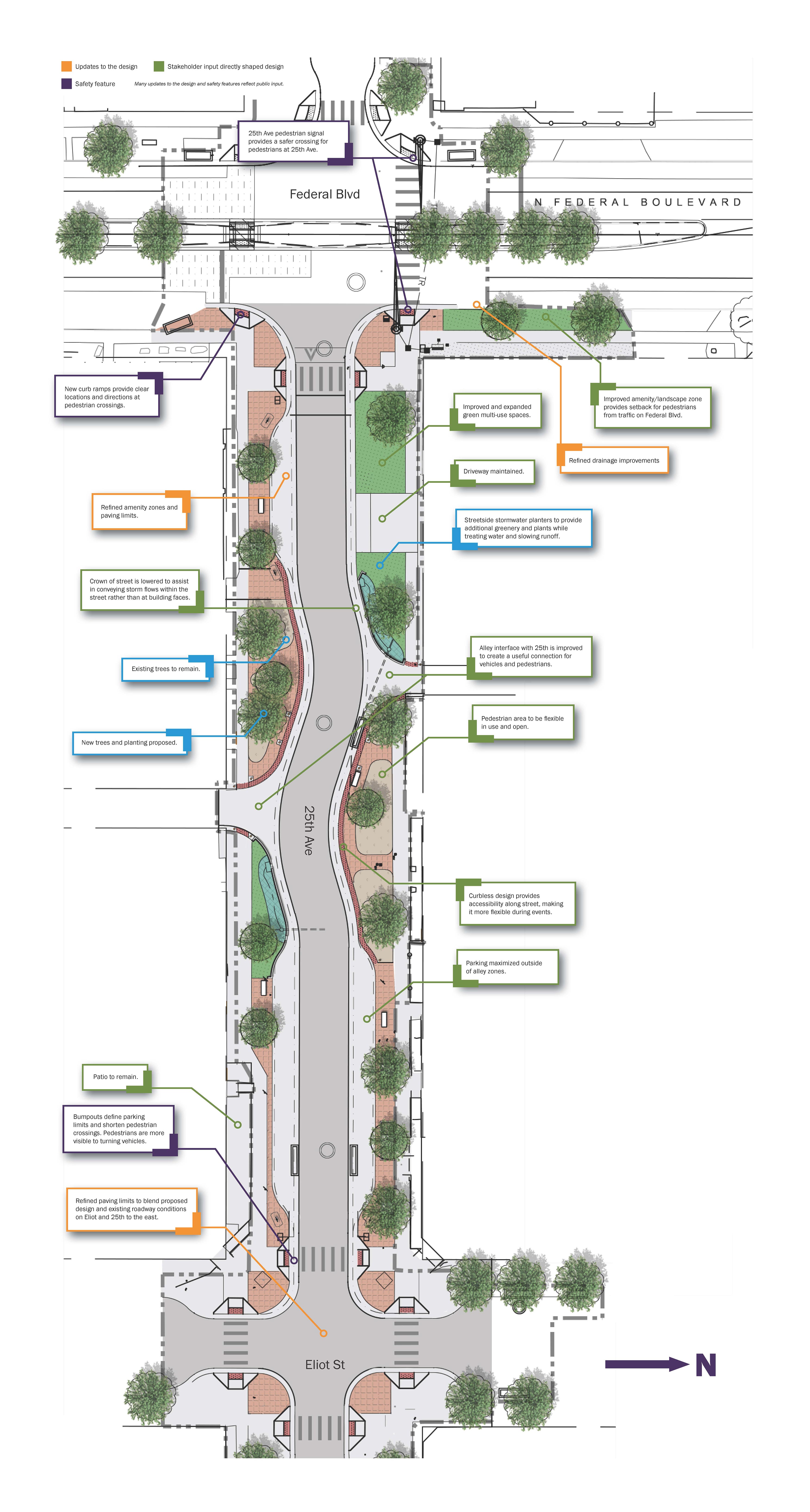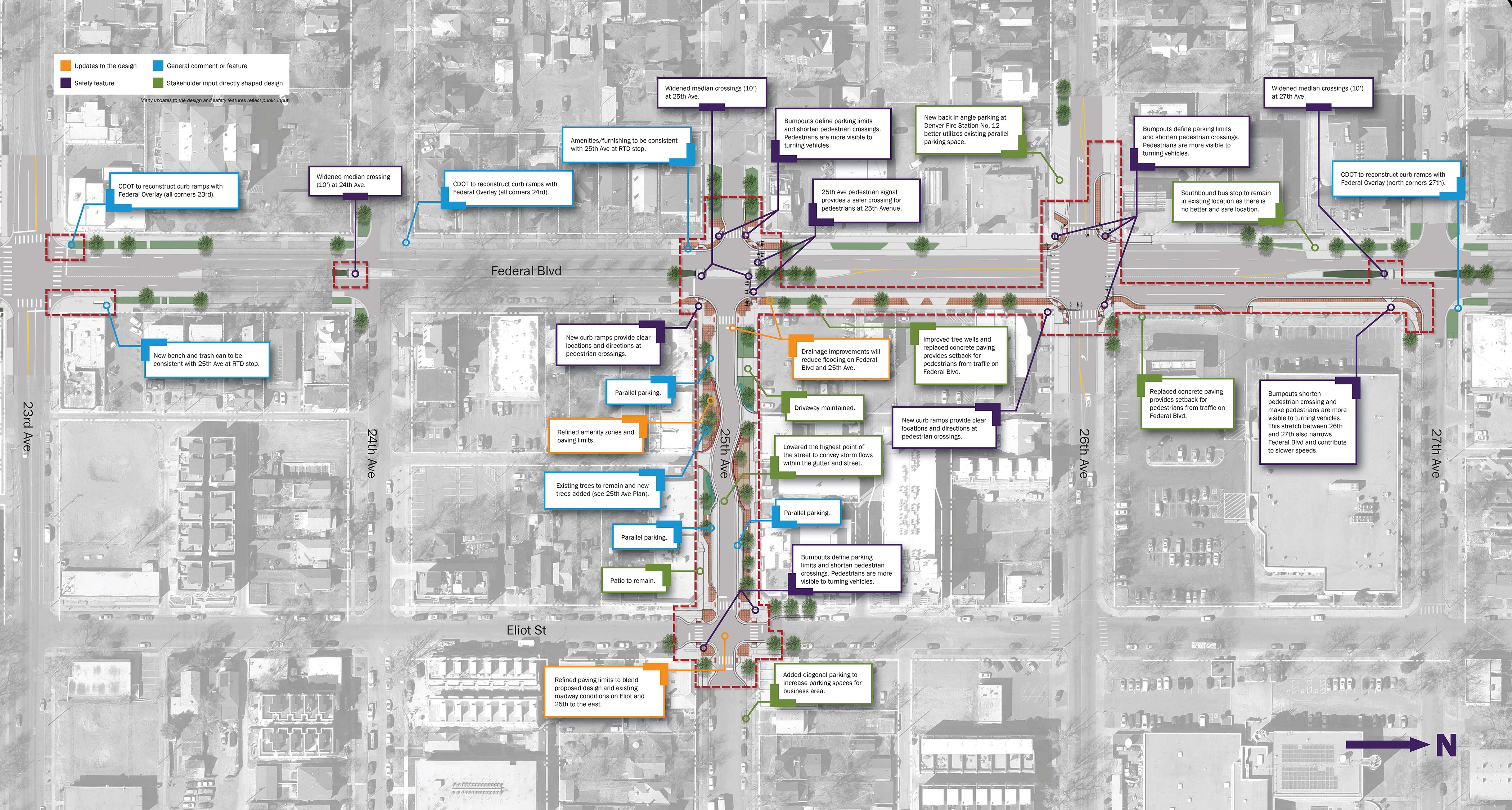 Our team analyzed what we heard from you, our partners, and other stakeholders to help us refine a draft design for Federal Blvd between 23rd and 27th Avenues, as well as 25th Ave between Federal Blvd and Elliot St. The designs follow various design standards and restrictions to make implementation successful in the future.
