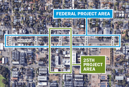 The Federal Blvd Pedestrian Improvements Project will design pedestrian improvements along Federal Blvd from 23rd to 27th Avenues, as well as 25th Ave between Federal Blvd and Elliot St.